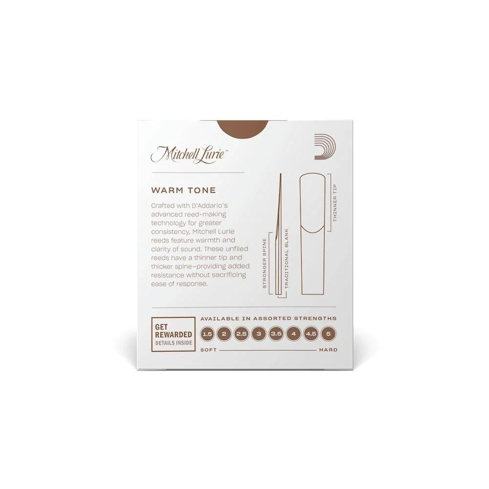 Mitchell Lurie Premium Bb Clarinet reeds are the go-to choice for advancing players, providing the warmth and clarity of sound necessary to take your playing to the next level. These reeds are unfiled, featuring a thinner tip and thicker spine--which add resistance without sacrificing ease of response.