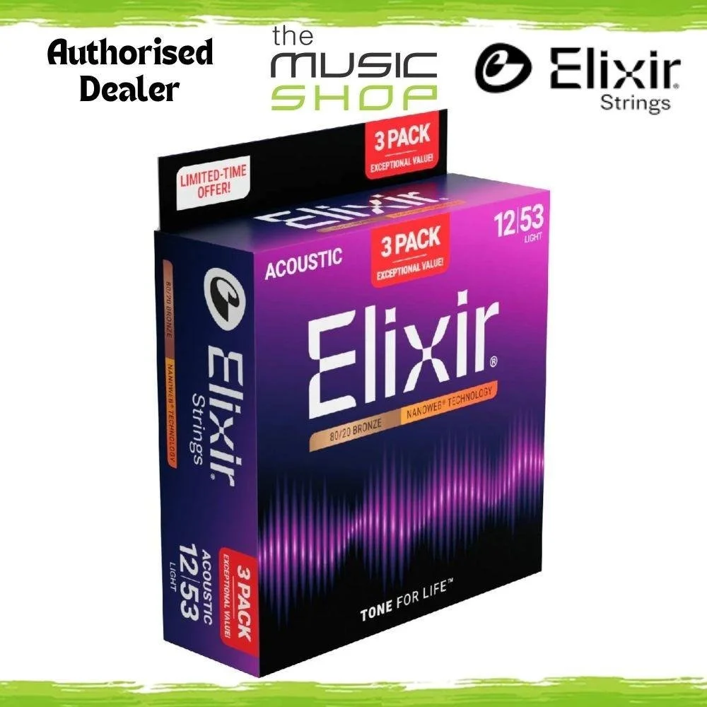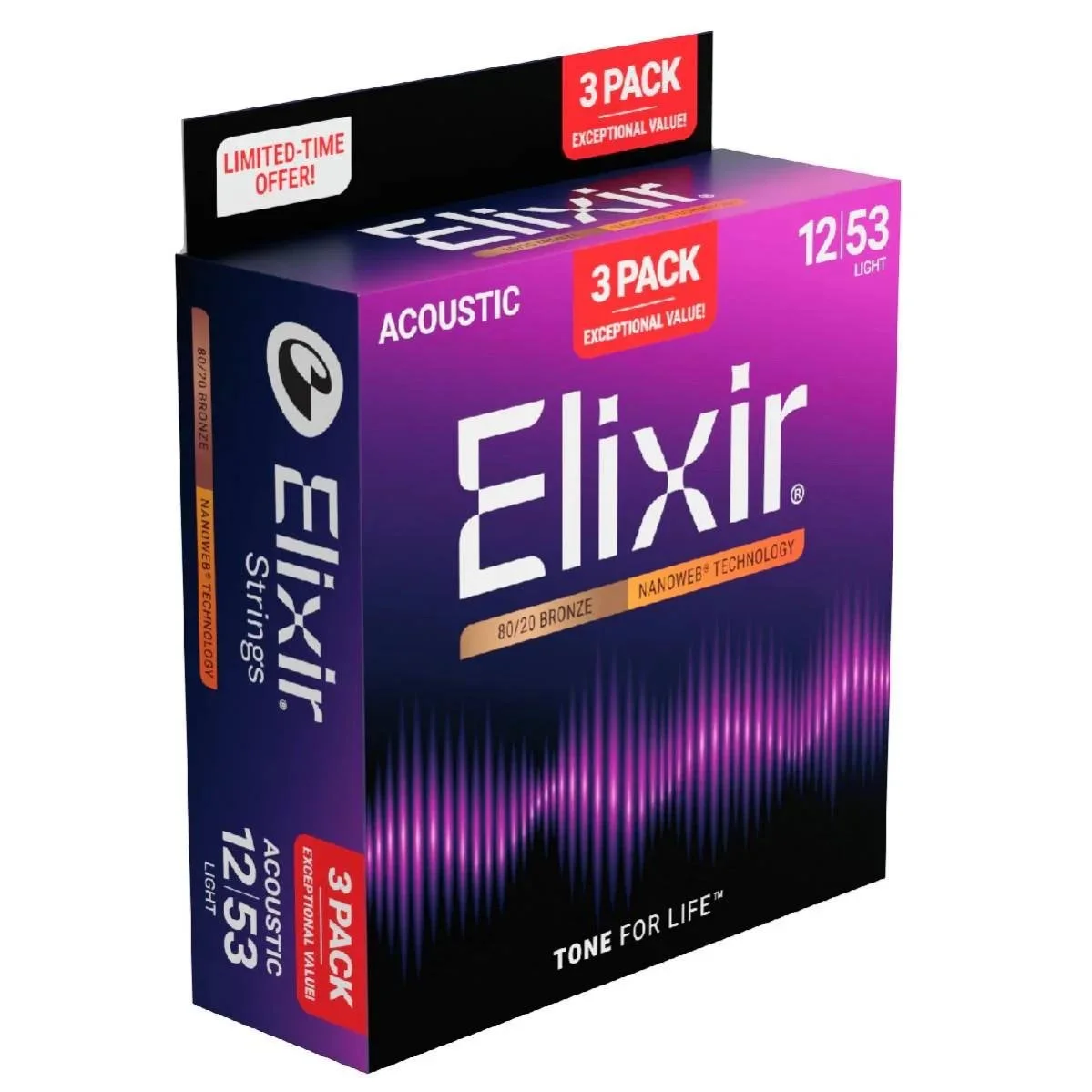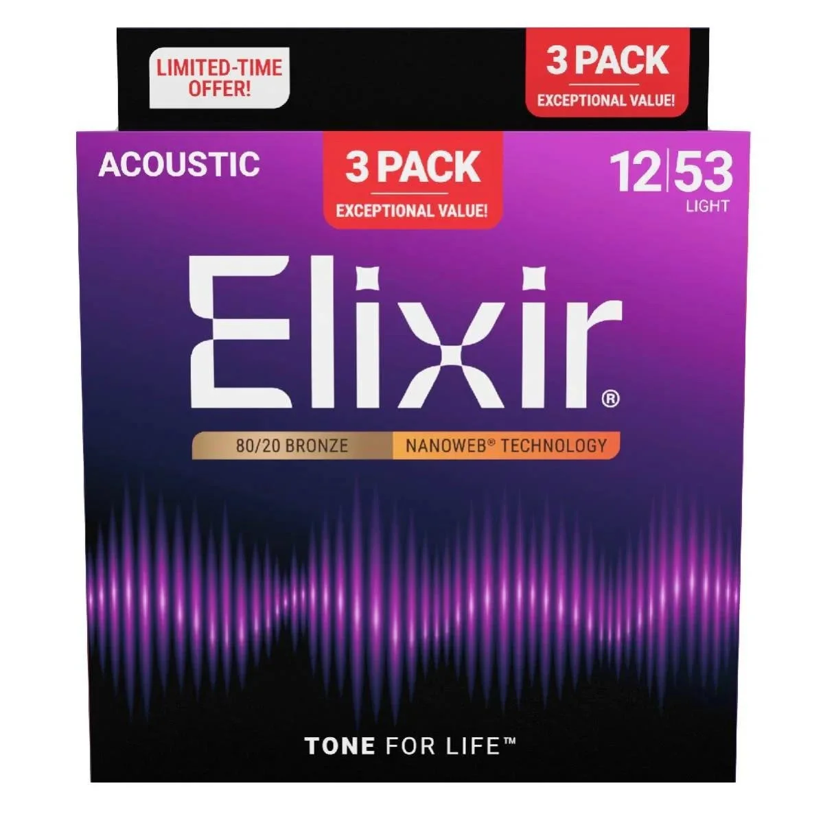 3 Pack of Elixir Nanoweb 12-53 Light Acoustic Guitar Strings, 80/20 Bronze 16565