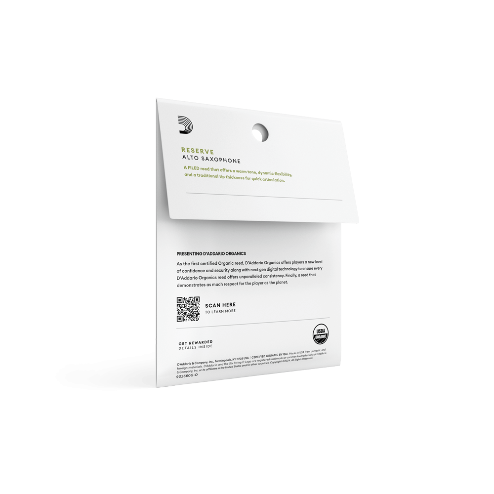 Organic Reserve reeds provide you with dynamic flexibility and exceptional, warm tone quality when playing due to their long vamp profile. These filed reeds feature a traditional tip to give you an ease of articulation and response. Each reed in the pack comes single-sealed in a recyclable paper reed holder and flow wrap.