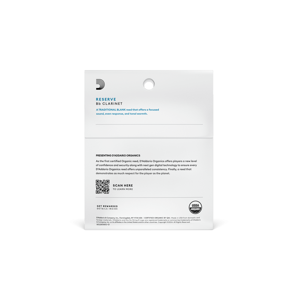 Organic Reserve reeds for Bb clarinet feature a shorter vamp for even tone in all registers, rounded tip corners for additional tonal warmth, plus a thinner tip thickness for quick response. Each reed in the pack comes individually-sealed in a recyclable paper reed holder and flow wrap.