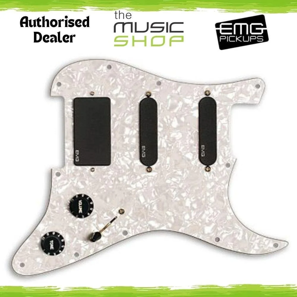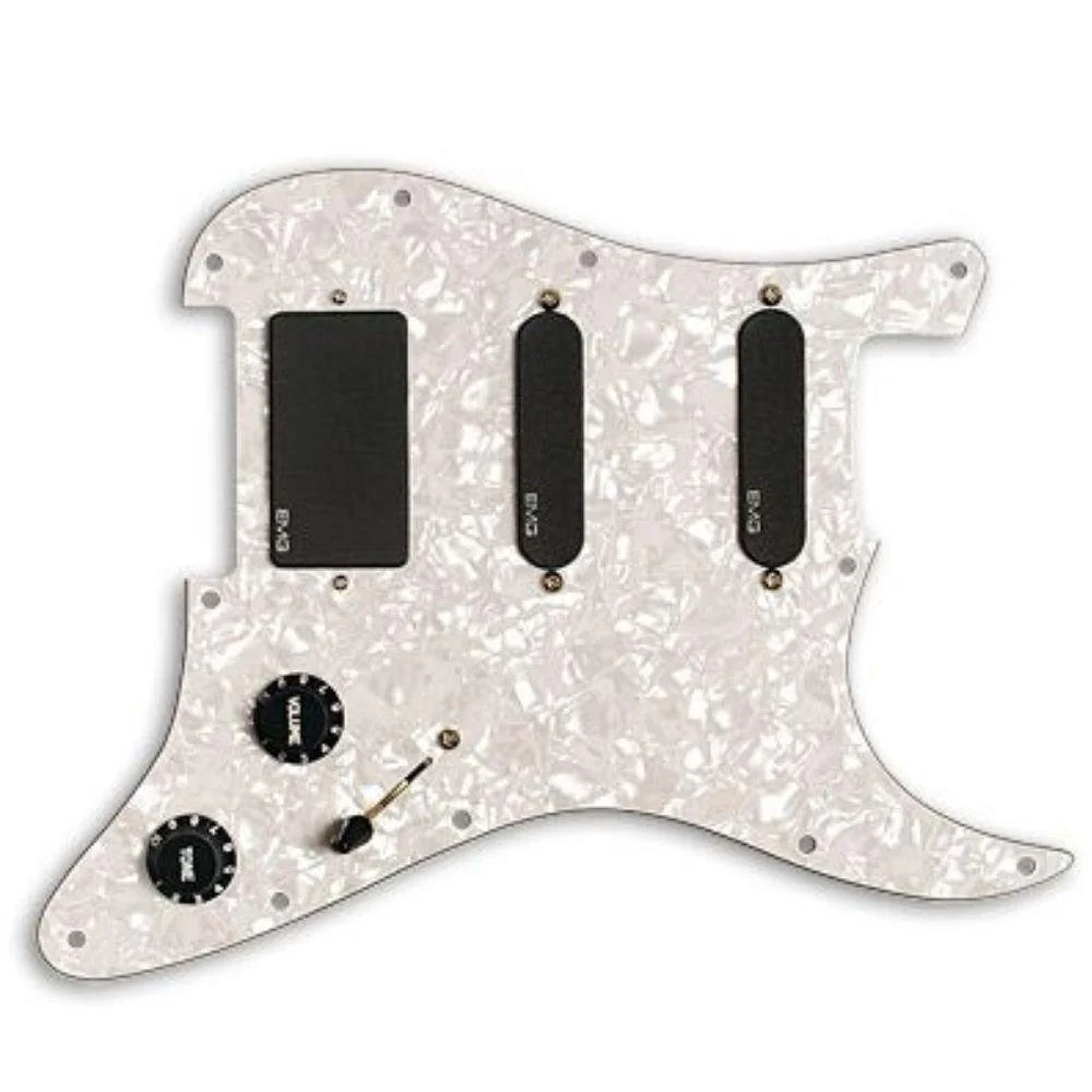 This system joins the EMG 81 humbucker with a pair of S single-coil pickups. These pickups are all built using ceramic bar magnets for the tightest, most controlled sound with incredible versatility and sustain. This setup comes with one tone and a master volume all wired on a custom 11-hole white pearl pickguard with contrasting black knobs.
