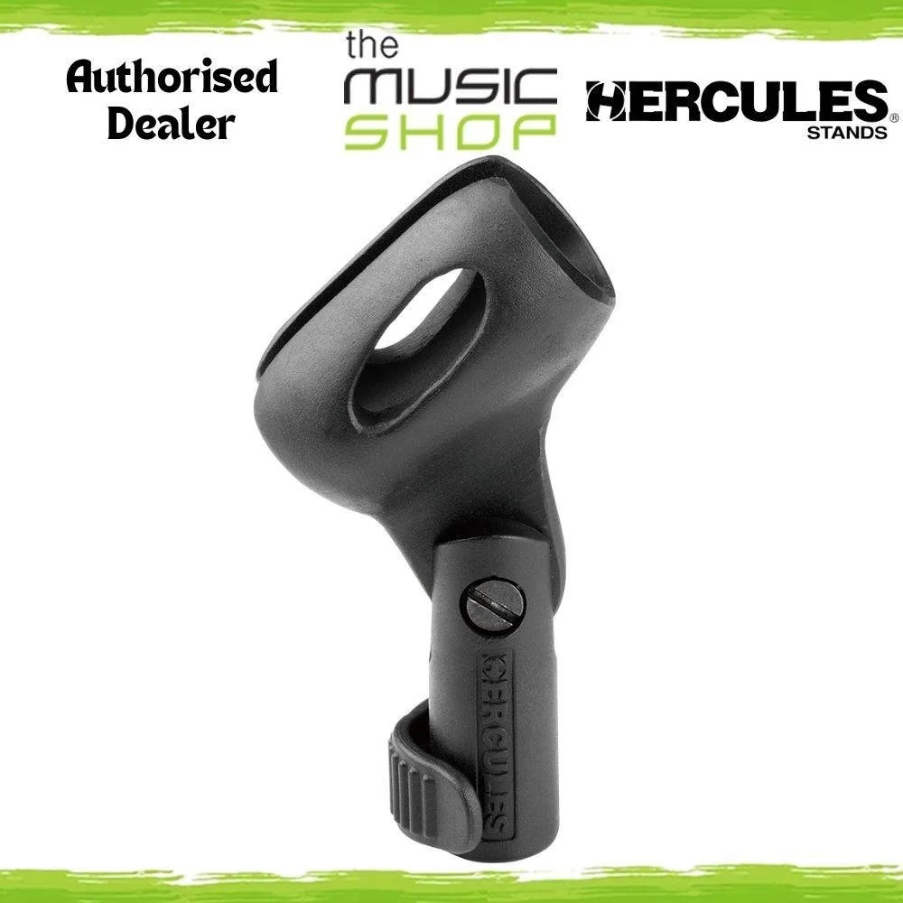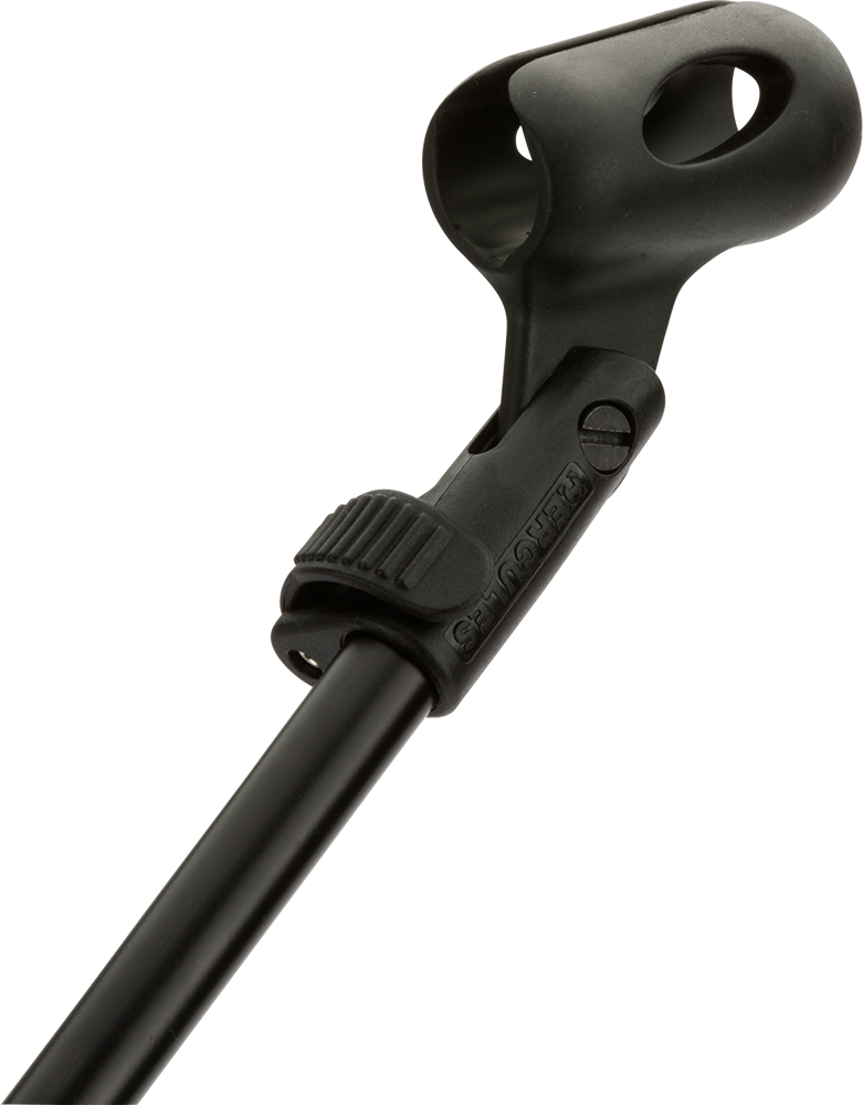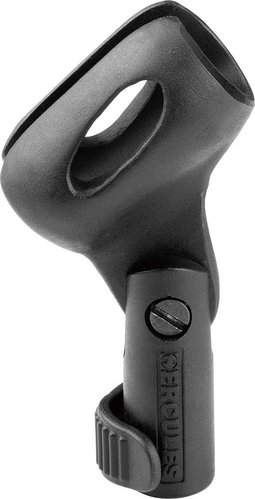 The HERCULES Microphone Holder MH101B connects to a mic stand with the flip lever. Works with both threaded and non-threaded stands.